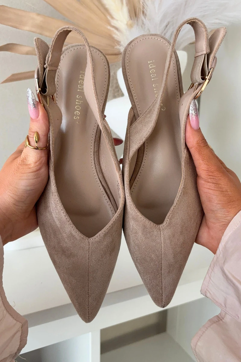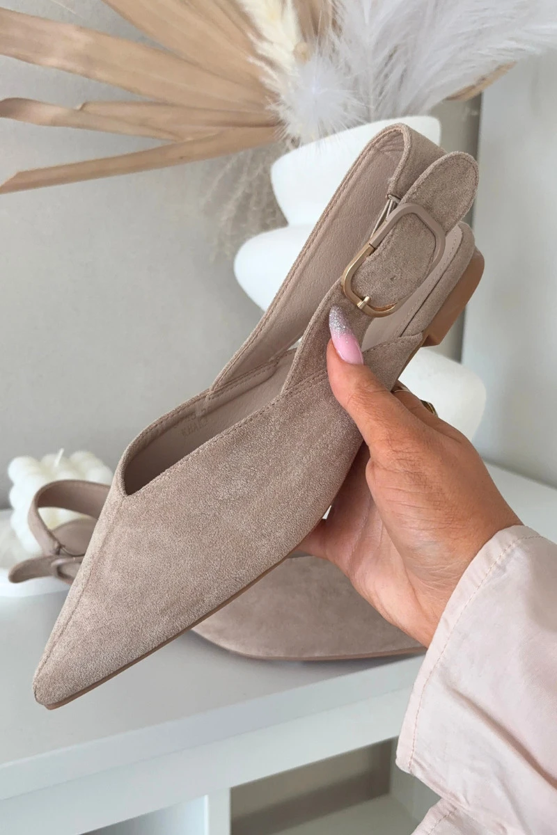 Dámské baleríny vyrobené z ekologické semiše jsou stylovou a pohodlnou volbou na každý den. Model na ploché podrážce zaručuje komfort a špičaté nosky dodávají eleganci a jemně zeštíhlují nohu. V zadní části je nastavitelné pásko zakončené velkou dekorativní přezkou, která přitahuje pozornost a je módním akcentem. Tyto baleríny jsou ideální pro ženské, moderní outfity. Při výběru velikosti se řiďte tabulkou velikostí.