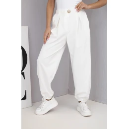 Tyto elegantní dámské kalhoty s vysokým pasem jsou nabídkou pro ženy, které si cení spojení pohodlí a stylu. Volný střih s mírně zúženými nohavicemi zakončenými stahovacími manžetami dává kalhotám krásný tvar na postavě a hodí se k mnoha stylizacím – jak každodenním, tak i elegantnějším. Ozdobný knoflík vpředu jim dodává šarm a klasické zakončení. Skvěle se kombinují s blůzkami, topy nebo sako, čímž vytvářejí módní a ženský vzhled.