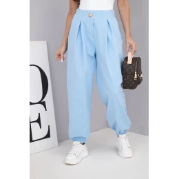 Dámské bavlněné kalhoty s vysokým pasem a ozdobným knoflíkem modré