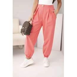 Dámské bavlněné kalhoty s vysokým pasem a ozdobným knoflíkem růžové