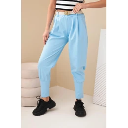 Dámske bavlnené nohavice s vysokým pásom a opaskom modré