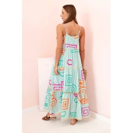 Tieto dámske šaty bez ramienok sú ideálnou voľbou na letné dni, keď chcete vyzerať štýlovo a cítiť sa pohodlne. Sú vyrobené zo 100 % ľahkej, priedušnej bavlny, očarujú farebným geometrickým vzorom v boho štýle a jemnou výšivkou v hornej časti. Mierne rozšírený strih dodáva postave ľahkosť a tenké ramienka odhaľujú ramená, takže sú ideálnou voľbou na dovolenku, prechádzky alebo letné stretnutia s priateľmi.