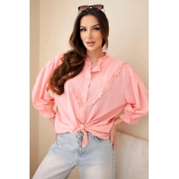 Košeľa vyniká efektným čipkovaním v tvare písmena V a jemným volánom vo výstrihu, ktorý jej dodáva ženský charakter. Ďalšou výhodou je zaväzovanie vpredu, ktoré umožňuje prispôsobiť strih vašej postave a vytvoriť módny outfit. Rukávy sú ukončené jemným nariasením, ktoré podčiarkuje ľahkosť celého modelu. Ideálne sa hodí na kombinovanie s džínsami, látkovými nohavicami alebo sukňou.