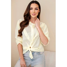 Košeľa vyniká efektným čipkovaním v tvare písmena V a jemným volánom vo výstrihu, ktorý jej dodáva ženský charakter. Ďalšou výhodou je zaväzovanie vpredu, ktoré umožňuje prispôsobiť strih vašej postave a vytvoriť módny outfit. Rukávy sú ukončené jemným nariasením, ktoré podčiarkuje ľahkosť celého modelu. Ideálne sa hodí na kombinovanie s džínsami, látkovými nohavicami alebo sukňou.