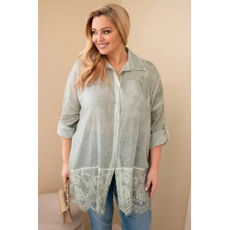 Ak hľadáte originálnu a štýlovú košeľu, ktorá upúta pozornosť a zároveň zabezpečí pohodlie pri nosení - táto spraná dámska košeľa s čipkovaným lemom je skvelou voľbou! Mäkký, spraný materiál jej dodáva jedinečný, mierne vintage charakter a ľahká bavlna zaručuje pohodlie počas celého dňa.