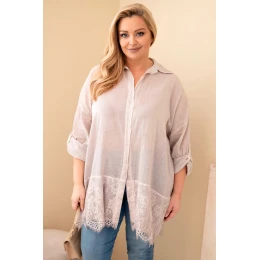 Dámske bavlnené tričko s čipkovaným lemom Plus Size Light Beige