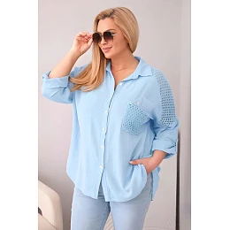 Košeľa má klasický golier a zapínanie na gombíky po celej dĺžke, čo jej dodáva elegantný charakter. Zvláštnosťou sú ozdobné čipkové vsadky na ramenách a na vrecku, ktoré celku dodávajú jemnú ženskosť a módny štýl. Praktické predné vrecko je ozdobným aj funkčným prvkom.
