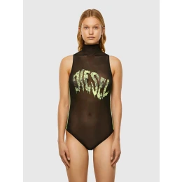Body bez rukávov vyrobené z mäkkej strečové sieťoviny, s rolákovým golierom. Predná strana je potlačená kvapkajúcim logom Diesel v odtieni jasne zelenom.