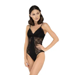 Černé body je smyslný a zároveň elegantní doplněk, který se uplatní v mnoha různých situacích. Záleží jen na vaší fantazii, zda se hodí jako základ pod halenku nebo jako samostatný kousek v duu se sakem. Ideální jako styling do ložnice. Toto body je vyrobeno z měkkého polyamidu a má měkké košíčky, zapínání v rozkroku na háčky a tenká nastavitelná ramínka. Košíčky jsou vyrobeny z hladké neprůhledné tkaniny. Boky z krásné květinové krajky. Složení: 80 % polyamid, 20 % elastan.