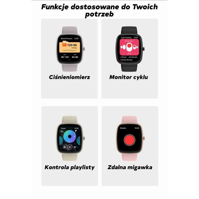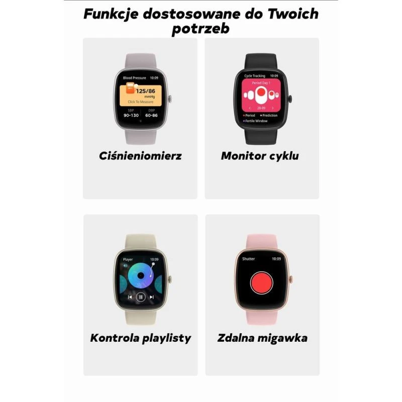 Ten model zadba też o Twoje zdrowie i samopoczucie – mierzy tętno, ciśnienie, poziom tlenu, liczy kroki i spalone kalorie, analizuje sen oraz monitoruje cykl menstruacyjny, przypominając o ruchu i nawodnieniu. Do tego daje szybki dostęp do powiadomień z aplikacji, sterowanie muzyką, zdalne zdjęcia, prognozę pogody, budzik, timer i funkcję „znajdź urządzenie” – wszystko, czego potrzebujesz, masz zawsze pod ręką.