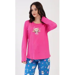 Dámske bavlnené dlhé pyžamo Medvedík I love you. Pyžamo sa skladá z trička s dlhým rukávom a dlhých nohavíc. Tričko je jednofarebné, zdobí ho obrázok medvedíka a nápis I LOVE YOU. Obrázky medvedíkov sa opakujú aj na nohaviciach, ktoré majú elastický pás a šnúrku na stiahnutie, ale nemajú vrecká. Použitý bavlnený materiál je pružný a príjemný na dotyk.