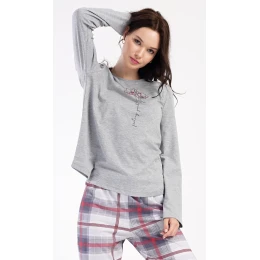 Dámske dlhé pyžamo Brigitte. Pyžamo sa skladá z trička s dlhým rukávom a dlhých nohavíc. Tričko je jednofarebné, zdobené obrázkom kvetov a malým nápisom. Kárované nohavice majú elastický pás a šnúrku na stiahnutie a nemajú vrecká. Použitý bavlnený materiál je pružný a príjemný na dotyk.