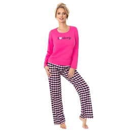 Pohodlné dámske pyžamo zo 100 % kvalitnej bavlny je ideálnou voľbou na chladnejšie noci. Klasické tričko s dlhými rukávmi a okrúhlym výstrihom zdobí módny nápis "I ♥ sleep", ktorý mu dodáva šarm a zdôrazňuje jeho ľahký, ženský charakter. Súčasťou súpravy sú dlhé, pohodlné nohavice v nadčasovom károvanom vzore, ktoré nielen skvele vyzerajú, ale zaručujú aj voľnosť pohybu a pohodlie počas celej noci. Vďaka prírodnému materiálu je pyžamo mäkké, vzdušné a príjemné na dotyk. Súprava je zabalená vo fóliovom vrecúšku - skvelý nápad na darček.