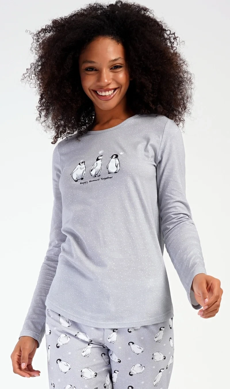 Dámske bavlnené dlhé pyžamo Tučniaky. Pyžamo sa skladá z trička s dlhým rukávom a dlhých nohavíc. Tričko je jednofarebné, zdobí ho obrázok troch tučniakov a malý nápis. Motív tučniakov sa opakuje na nohaviciach, ktoré majú elastický pás a šnúrku na stiahnutie, ale nemajú vrecká. Použitý bavlnený materiál je pružný a príjemný na dotyk.