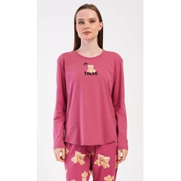 Dámske bavlnené dlhé pyžamo Ružový medvedík. Pyžamo sa skladá z trička s dlhým rukávom a dlhých nohavíc. Tričko je jednofarebné, zdobené obrázkom medvedíka a nápisom THERE. Obrázky medvedíkov sa opakujú na nohaviciach, ktoré majú elastický pás a šnúrku na stiahnutie, ale nemajú vrecká.