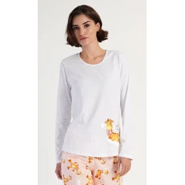 Dámske dlhé pyžamo Žirafa. Pyžamo sa skladá z trička s dlhým rukávom a dlhých nohavíc. Tričko je jednofarebné, zdobí ho malý nápis a obrázok spiacej žirafy. Rovnaký motív sa opakuje aj na nohaviciach, ktoré majú elastický pás a šnúrku na stiahnutie, ale nemajú vrecká. Svetlosivé tričko sa skladá zo 70 % bavlny, nohavice sú čisto bavlnené. Použitý materiál je pružný a príjemný na dotyk.