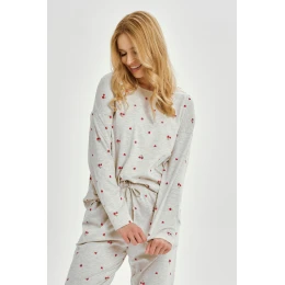 Piżama damska ADELE to połączenie przytulnego komfortu i świeżego, dziewczęcego designu. Wykonana z miękkiej i oddychającej tkaniny o składzie 98% bawełna i 2% poliester, zapewnia wygodę przez całą noc. Koszulka z długim rękawem i okrągłym dekoltem ozdobiona została uroczym printem w wiśnie. Do kompletu dołączone są długie spodnie z kieszeniami na biodrach i wiązanym sznureczkiem w pasie, który pozwala dopasować obwód według potrzeb. To idealny zestaw do snu i domowego relaksu – miękki, kobiecy i praktyczny.