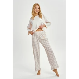Piżama damska VERA to idealne połączenie wygody i kobiecego stylu. Wykonana w całości z wysokogatunkowej, 100% bawełny, jest miękka, przewiewna i przyjemna dla skóry. Gładka koszulka z długim rękawem ozdobiona została subtelnym nadrukiem na piersi. Uzupełniają ją długie spodnie w drobną kratkę, których nogawki wykończone są dekoracyjną falbanką. Elastyczna gumka w pasie zapewnia wygodne dopasowanie bez ucisku. Komplet idealny na nocny odpoczynek lub wieczorny relaks w domowym zaciszu.