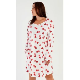 Dámske domáce šaty s dlhými rukávmi Heart. Tieto pohodlné domáce šaty s okrúhlym výstrihom zdobí potlač srdiečok. Majú dlhé rukávy, dĺžku po kolená a praktické vrecká. 70 % bavlnený materiál je príjemný a pružný na dotyk.