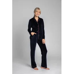 Spěte, ale stylově v těchto sametových kalhotách s manžetami a ozdobným lemováním, které mají siluetu inspirovanou pánskou módou. Vytvořte si soupravu s naší sametovou pyžamovou košilí s ozdobným lemováním.