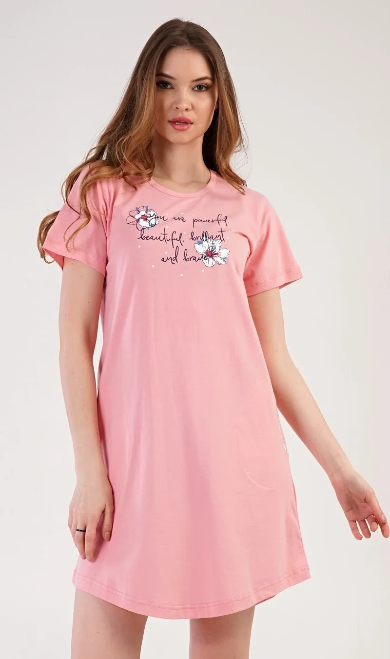 Dámske bavlnené domáce šaty s krátkym rukávom Betty. Tieto šaty s okrúhlym výstrihom zdobí kvetinová potlač a jemný nápis. Na bokoch majú všité vrecká zdobené lemovaním. Použitý bavlnený materiál je príjemný a pružný na dotyk. Domáce oblečenie je vhodné na spanie a voľnočasové aktivity.