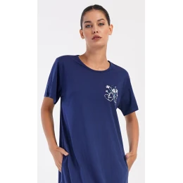 Dámské bavlněné domácí šaty s krátkým rukávem Janette. Domácí jednobarevné šaty s kulatým výstřihem a kapsami zdobí na hrudi obrázek s květinovým motivem. Použitý bavlněný materiál je příjemný a poddajný na dotek. Šaty jsou pohodlné, vhodné na spaní i na denní nošení.