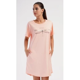 Dámské bavlněné domácí šaty s krátkým rukávem Vážka. Domácí jednobarevné šaty s kulatým výstřihem a kapsami zdobí obrázek vážky a nápis 'Beautiful'. Použitý bavlněný materiál je příjemný a poddajný na dotek. Šaty jsou pohodlné, využijete je téměř při všech volnočasových aktivitách. Jsou vhodné na spaní i na denní nošení.