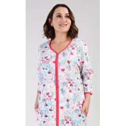 Dámské bavlněné domácí šaty s tříčtvrtečním rukávem Elen. Domácí šaty mají zapínání na zip a jsou ozdobené potiskem květin. Na předním díle jsou našité na bocích praktické kapsy. Bavlněný materiál je poddajný a jemný na dotek.
