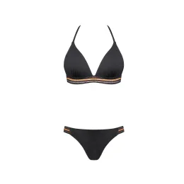 Dámske dvojdielne plavky. Vrchný diel trojuholníkovej košíčky, vystužené, bez kostíc. Na chrbte zapínanie, za krkom zaväzovanie.