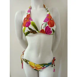 Dámské dvoudílné bikiny, vrchní díl s možností vyztužení, bez kostic, trojuhelníkový střih. Zavazování za krkem a na zádech.