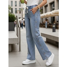 Dámske džínsy so širokými nohavicami voľného strihu poskytujú voľnosť pohybu a pohodlie pri každodennom nosení. Elastický pás so šnúrkou na stiahnutie umožňuje jednoduché prispôsobenie. Džínsový materiál dobre sedí na tele a zachováva si svoj tvar. Ozdobné patentky na bokoch dodávajú celkovému vzhľadu moderný nádych.