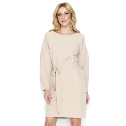 Dámské elegantní šaty s páskem středně dlouhé béžové. Velmi jemné a elegantní šaty s páskem, dlouhými rukávy a kulatým výstřihem jsou vyrobeny z vysoce kvalitního materiálu. Šaty jsou vhodné na společenské události jako je ples, svatba nebo i na běžné nošení do práce.