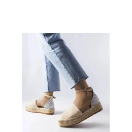 Béžové espadrilky s brokatovou vložkou Myasia jsou ideální obuví na léto. Vyrobené z vysoce kvalitní ekologické kůže zaručují pohodlí a odolnost. Nízký podpatek a absence podšívky je dělají ideální na teplé dny. Podrážka vyrobená z béžové gumy zajišťuje stabilitu a pohodlí během chůze. Zapínání na sponu umožňuje snadné přizpůsobení obuvi noze. Tyto espadrilky budou určitě skvělým doplňkem letního šatníku.