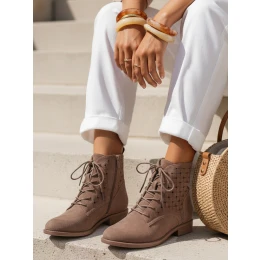 Tieto čižmy vyrobené z ekologického semišu s tkanou perforovanou štruktúrou sú navrhnuté tak, aby podporovali priedušnosť a jednoduché používanie v prechodných ročných obdobiach. Nízky podpätok podporuje stabilitu pri každodennej chôdzi. Kombinácia šnurovania a zipsu umožňuje presné obopnutie členku.