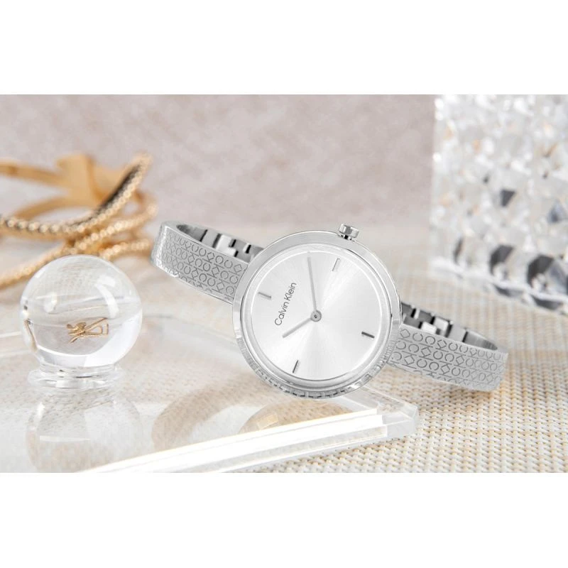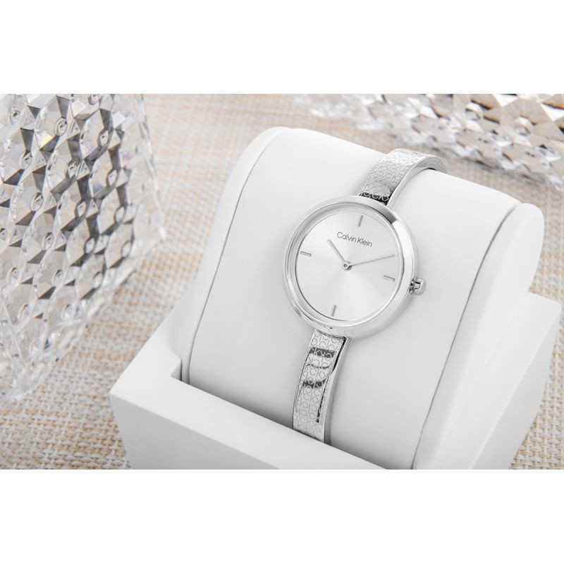 Hodinky CALVIN KLEIN Iconic sú esenciou minimalistickej elegancie, ktorá sa dokonale hodí k estetike modernej ženy. Ich dizajn sa vyznačuje subtílnym ciferníkom so žiarivým slnečným lúčom vybrúseným v strieborných tónoch, ktorý nádherne odráža svetlo a dodáva hodinkám vznešený charakter. Charakteristickým prvkom modelu je polotuhý náramok s jemne zaobleným, oválnym profilom. Vďaka svojmu dizajnu dokonale sedí na zápästí a vytvára s ním takmer jednotu - ako elegantná šperková obruč. Jeho reliéfny, štruktúrovaný povrch zdobený opakujúcim sa logom "ck Calvin Klein" je módnym akcentom, ktorý dodáva náramku moderný, dizajnérsky nádych a dáva hodinkám vyniknúť oproti klasickým modelom.