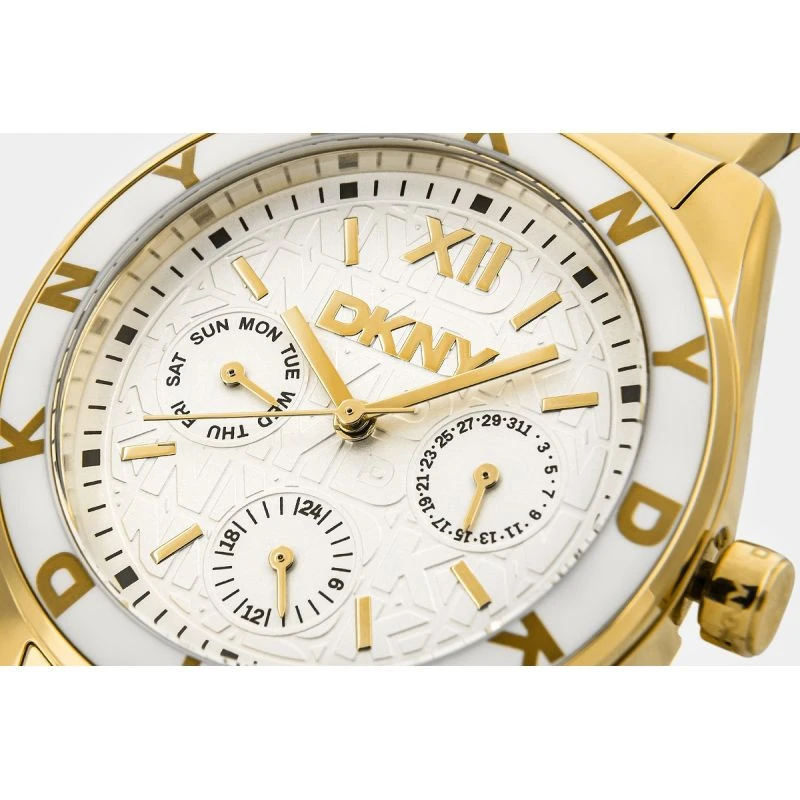 - Koperta: złota + biały bezel ze złotym logo DKNY