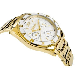 Zegarek dla kobiet, które kochają blask, styl i perfekcyjne detale. Złota koperta wykonana z wysokiej jakości stali nierdzewnej przyciąga wzrok swoją wyrazistością, a biały bezel z wytłoczonym logo DKNY nadaje całości nowoczesnego charakteru. Jasna tarcza o subtelnym wzorze w duecie ze złotymi detalami tworzy ponadczasowy design, który idealnie pasuje do każdej stylizacji. Trzy subtarcze nie tylko dodają zegarkowi wyrafinowanego wyglądu, ale także zapewniają praktyczne funkcje – wskaźnik dnia tygodnia, datownik oraz tryb 24-godzinny, które ułatwiają codzienne planowanie.Solidna bransoleta ze stali nierdzewnej gwarantuje komfort noszenia i trwałość, sprawiając, że ten model to idealne połączenie luksusowego wyglądu z funkcjonalnością.