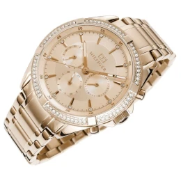 Ten zegarek to prawdziwa biżuteria wśród dodatków dla kobiet. Jego ciepły, delikatnie połyskujący odcień przywodzi na myśl blask zachodzącego słońca, odbijający się od eleganckiej bransoletki, która subtelnie owija się wokół nadgarstka. Ramka tarczy, zdobiona połyskującymi cyrkoniami to prawdziwy akcent biżuteryjny - mieni się jak diamentowa aureola, dodając zegarkowi niezwykłego blasku. Każdy indeks zdobiony cyrkonią to uzupełnienie symfonii detali, harmonijnie łączących się w jedno. Na tarczy rozgrywa się taniec czasu, dzięki dodatkowym, misternie zaprojektowanym subtarczy, które stanowią nie tylko ozdobę, ale i funkcjonalne narzędzie. Całość jest jednocześnie bogata i subtelna – zaprojektowana, by poruszyć zmysły, uwieść blaskiem i tajemniczością.