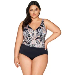 Dámske jednodielne plavky 61 black plus AVA - čierne - široké ramienka - ozdobné nariasenie opticky zoštíhľuje pás - elegantná kvetinová potlač - skryté elastické košíčky - nakopené košíčky