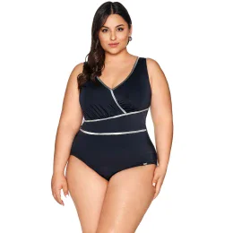 Dámske jednodielne plavky 62 black AVA - čierna farba - tvarujúci strih - široké ramienka - výstrih do V jemne zvýrazňujúci poprsie - vhodný výrez na chrbte - elegantný dizajn s lesklými stuhami