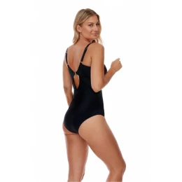 Tyto jednodílné plavky jsou pletené s motivem exotických květin ve svěžích barvách na pozadí vodorovných šedých a černých pruhů. Byly vytvořeny pro ženy s plnějšími tvary a jsou ideální na pláž i k bazénu. Střih plavek kombinuje funkčnost a eleganci. Plavky mají všitou podprsenku s měkkými košíčky s kosticemi a nastavitelnými neodnímatelnými ramínky. Šířka a typ ramínek jsou přizpůsobeny velikosti plavek. Černé látkové vsadky na bocích opticky zeštíhlují a tvarují siluetu. Zadní díl plavek se zapínáním na přezku.