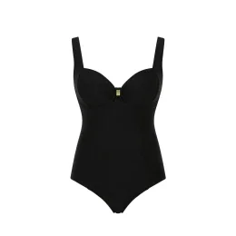 Romantické plavky z kolekce Marianna značky Panache jsou ideální pro váš malý útěk. Elegantní a zároveň stylový kousek ve snové černé barvě. Košíčky s kosticemi dokonale vytvoří zvýrazněnou postavu a zároveň poskytnou požadovanou oporu. Mezi poprsím je navíc přidán malý zlatý obtisk, který okouzlujícímu kousku dodává punc luxusu. Do živůtku jsou vetknuty zeštíhlující panely, které nabízejí ještě lichotivější styl. Mírné zakrytí zadního dílu pokračuje v elegantním tématu. Vnitřní panely ze síťoviny Power Mesh nabízejí mírnou kontrolu bříška, která přidává další vyhlazující prvek.