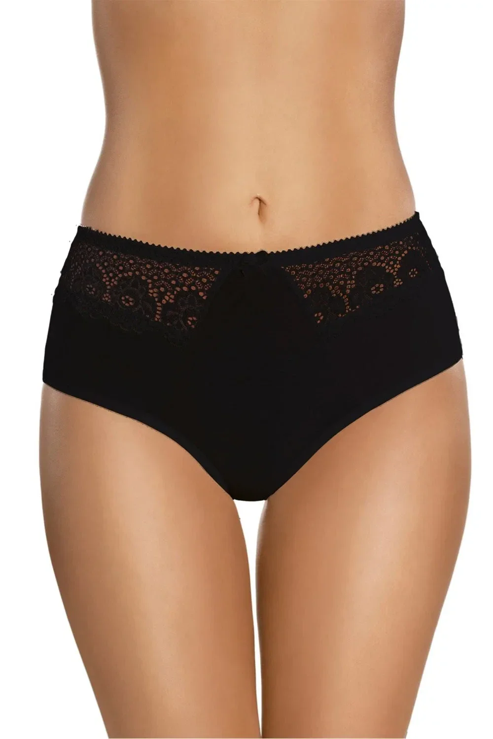 Dámske nohavičky 063 Gabidar - čierna farba - nohavičky majú klasický strih a ľahko zvýšený pás - na prednej strane majú jemnú čipku so vzorom - elegantný dizajn - na hornom leme roztomilá mašličkaMateriálové zloženie: 95% bavlna + 5% elastan