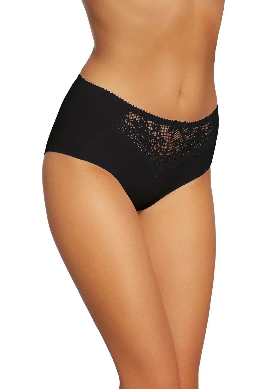 Dámske nohavičky 126 black GABIDAR - čierna farba - klasický strih - plnšie boky - predný diel zdobený čipkovou vsadkou s kvetinovým motívomMateriálové zloženie: 95% bavlna + 5% elastan