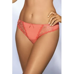 Dámske nohavičky 1428 Ava - koralová farba - nohavičky majú klasický strih - na bokoch majú jemný tyl s výšivkou v rovnakej farbe - sed je vystužený látkou - na hornom leme roztomilá mašlička Zloženie materiálu: 91% polyamid + 5% bavlna + 4% elastan