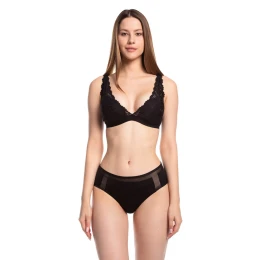 Kalhotky jsou ušité z hladkého mikrovlákna a jsou ozdobené vsadkami z jemné síťoviny. Model je vyrobený pomocí laserové technologie, má ultra tenké lemování okrajů a nerýsuje se pod oblečením.