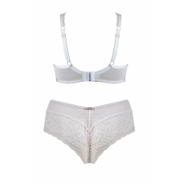 Zadní díl kalhotek je vysoko vykrojený. Vrchní část zadního dílu tvoří drobně puntíkovaný tyl a spodní část je ušitá z krajky. Přední díl modelu je vyrobený z bílé krajky s květinovým motivem a z tylu v pudrově růžové barvě.
