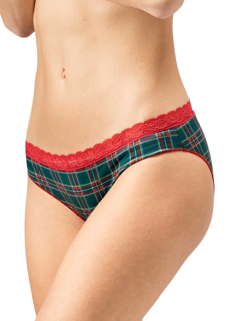 Dámske nohavičky Cotonella. Nohavičky majú klasický strih, sú vyrobené z jemného materiálu s vianočným dizajnom av páse majú červenú pružnú čipku. .