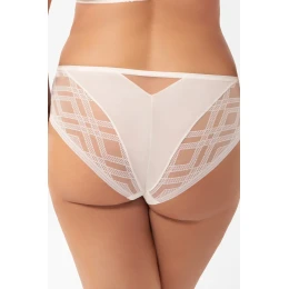 Dámské kalhotky. Vysoký střih. Otevřený střih. Zakrývá téměř celý zadeček. Vyrobeno z elastického tylu ve dvou barvách a elastické krajky. Vzadu zakončeno krajkovým lemem. Bavlněný rozkrok