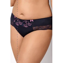 Klasické, krásne nohavičky K 295 Cynthie Gorsenia - predná časť je zdobená granátovo-ružovou výšivkou a ružovými mašličkami - nohavičky sú zdobené čipkou - vzadu je trojuholník z jemnej čipky - nohavičky sú lemované gumou Zloženie materiálu: 90% polyamid + 7% elastan + 3% polyester
